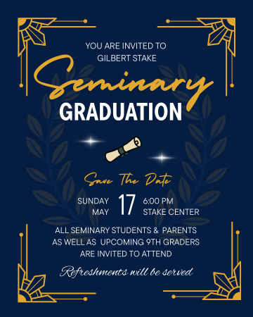 May 17 2026 Gilbert Stake Seminary Graduation – Graduación del Seminario de la Estaca Gilbert Featured 6:00 pm - 8:00 pm Gilbert Arizona Stake 777 East Elliot Road, Gilbert Event Details Get Directions