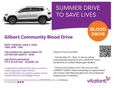 Gilbert Community Vitalant Blood Drive-Summer Drive to Save Lives. Come to the Church of Jesus Christ of Latter Day Saints Gym on Tuesday, June 2, 2026 between 3 pm-7 pm.Continue reading "2026 Community Vitalant Blood Drive – Campaña de donación de sangre Vitalant de la comunidad"